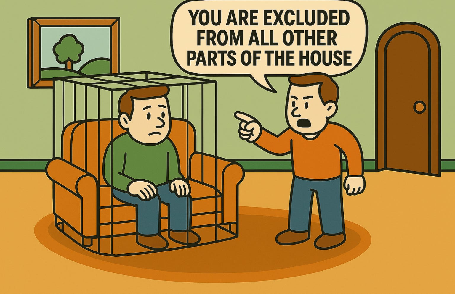 This brings us to our final example to discuss. Recall that in this example, A has been invited into B’s house, and when A sits down on B’s couch, B announces that A is excluded from all areas of the house except for where he is currently situated. We can even say B is so strict about this that he regards the act of breathing by A an encroachment, as it requires A expanding his chest into areas of the house B forbids. In such a scenario, is A obligated to remain on the couch and suffocate, or can he get up and justifiably walk out of B’s house?