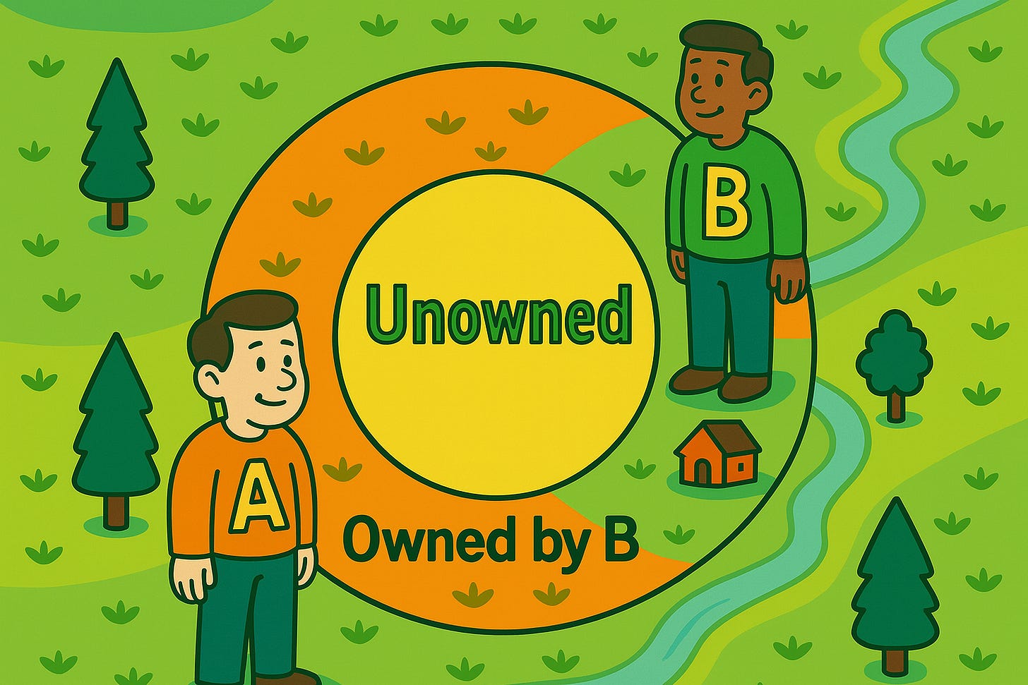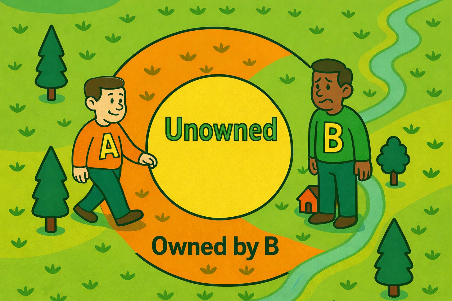 Furthermore, it is questionable whether it is accurate to say B is “controlling” the unowned interior. All B is doing is preventing people from crossing his property. To do this, he certainly must have control of his property, but this does not necessitate that he is controlling the unowned interior in any meaningful way. In addition, I agree with Kinsella that the reason we obtain ownership of the unowned resources we mix our labor with does not bottom out at “because we mixed our labor with them” but rather results from the fact that mixing our labor with it establishes an objective link between us and the resource. As such, even if it is true that B is controlling the unowned interior without mixing his labor with it, this does not itself mean that B cannot have any ownership claim over it, because if he is truly controlling the interior in anything but a Pickwickian sense, then he has arguably established an objective link between him and the interior without mixing his labor with it.