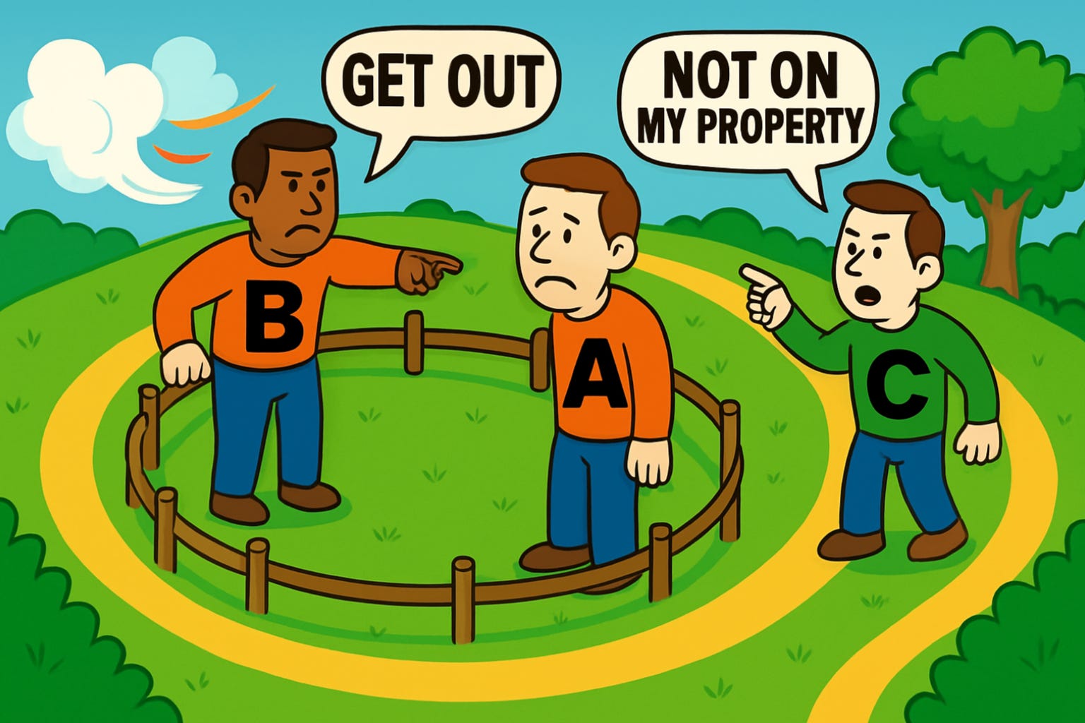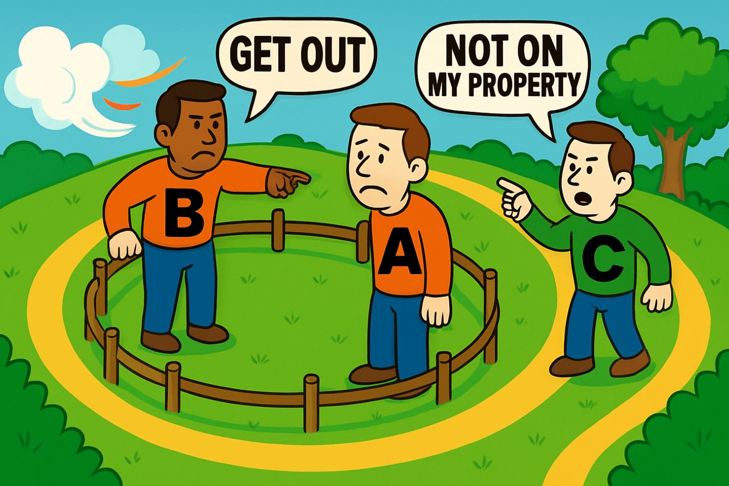 B orders A to leave his property—something within his rights as the owner—but in order to leave B’s property, A must necessarily cross onto C’s property3, but C has forbidden A from setting foot on his property.